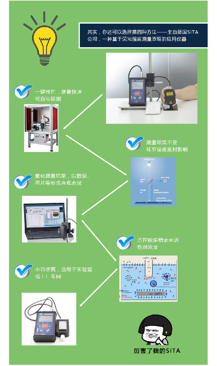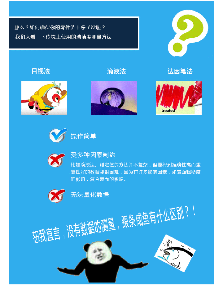 手機金屬、陶瓷、玻璃外殼、屏幕、指紋片,在沖壓、CNC、拋光、絲印時,無可避免地使用到各種切削液、潤滑油、冷卻液、拋光物質(zhì)和膠水等。假如在進行表面處理——如陽極氧化、電鍍、噴砂及AF鍍膜前,這些污染物質(zhì)有殘留,便極容易出現(xiàn)附著力不良、顏色不均勻、斑點等問題。而傳統(tǒng)的測試方法,如目測、達因筆測試,都無法保障清洗質(zhì)量穩(wěn)定性。