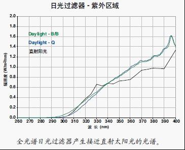 日光、延展紫外線、或窗玻璃過濾器用來降低不需要的輻射,獲得接近測試材料最終應(yīng)用條件的光譜。氙燈模擬戶外曝曬條件時(shí)通常使用日光過濾器。氙燈試驗(yàn)箱所有款式和型號(hào)的日光過濾器,都必須符合ISO 4892、ISO 11341 或 ASTM G155 中的光譜要求。它們產(chǎn)生的光譜非常接近直射太陽光。