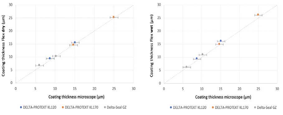圖:比較顯微鏡法和Flex在干燥狀態(tài)下測(cè)量涂層厚度(左:Flex測(cè)量干膜,右:Flex測(cè)量濕膜)。兩種測(cè)量設(shè)備具有很高的相關(guān)性(R2 = 0.998)。顯微鏡測(cè)量法的標(biāo)準(zhǔn)誤差小于1.5 μm,coatmaster Flex的測(cè)量標(biāo)準(zhǔn)誤差小于0.3 μm。