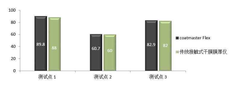 使用涂魔師coatmaster非接觸膜厚分析儀與干膜測(cè)厚儀在鋁型材上同一位置對(duì)比測(cè)試,測(cè)試數(shù)據(jù)差異小于5微米。,且涂魔師coatmaster Flex重復(fù)性和精度更好;