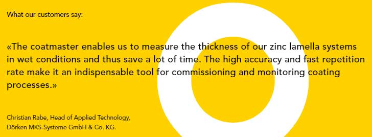 “我們使用coatmaster來(lái)測(cè)量固化前的鋅片涂層防腐蝕系統(tǒng),它能節(jié)省我們大量的時(shí)間成本。該設(shè)備具有快速測(cè)量、測(cè)量精度高和重復(fù)性好等優(yōu)點(diǎn),成為高效調(diào)整工藝參數(shù)和監(jiān)測(cè)工藝質(zhì)量的關(guān)鍵工具?!?/p>
