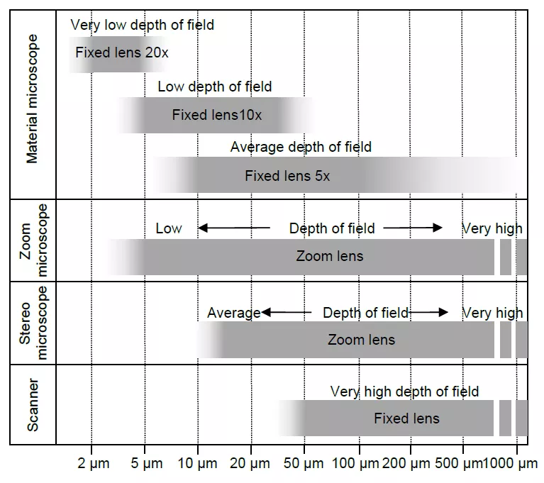 光學(xué)顯微技術(shù)是清潔度檢測(cè)最常用的方法,VDA19標(biāo)準(zhǔn)列出了各類型顯微鏡分析的尺寸范圍,材料顯微鏡具有更高的XY分辨能力,可以分析更小尺寸的顆粒,放大倍數(shù)20X及以上物鏡的數(shù)值孔徑大于0.4,常用于顆粒高度分析;變焦顯微鏡和立體顯微鏡擁有更大的景深和視野,通常用于大顆粒的快速分析。