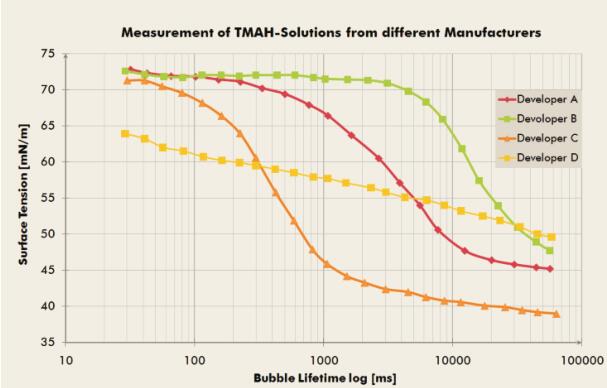 四甲基氫氧化銨(TMAH)溶液,在晶片生產(chǎn)中用作CMP(化學機械拋光)預清洗劑,或在半導體領(lǐng)域的光刻工藝中作為顯影劑。為了完全潤濕晶片表面,通常會在TMAH溶液中加入表面活性劑以降低其表面張力。確保一個穩(wěn)定且不與表面幾何形狀相關(guān)的蝕刻過程。
