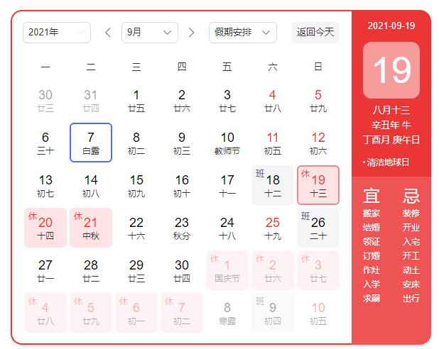 中秋節(jié)9月19日(星期日)至9月21日(星期二)放假調(diào)休3天,9月18日(星期六)正常上班。