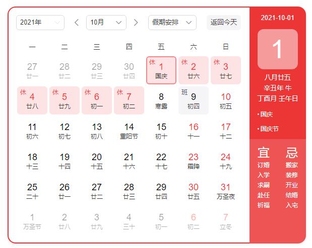 國慶節(jié)10月1日(星期五)至10月7日(星期四)放假調(diào)休7天,9月26日(星期日)、10月9日(星期六)正常上班。