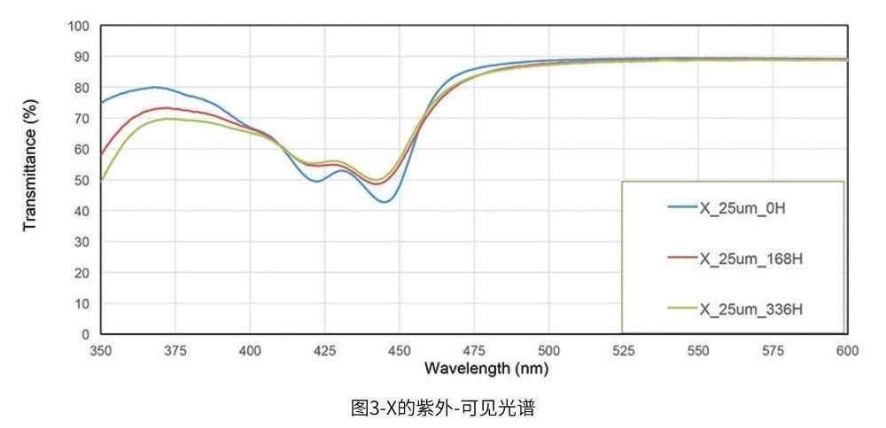 在QUV紫外老化箱進(jìn)行加速老化試驗(yàn)后,觀察紫外-可見光譜的變化。隨著紫外加速時(shí)間的推移,410-460 nm處的x透射率越來越高,如圖3所示(第14頁)。這是輻射導(dǎo)致染料降解的結(jié)果。如果聚合物含有吸收光線的雜質(zhì),它就會(huì)對(duì)紫外線敏感。因此,透射率在紫外區(qū)下降。相比之下,通過照射,BL在380-440 nm區(qū)域輕微退化,并且在500 nm的透射率結(jié)果保持相當(dāng)高。