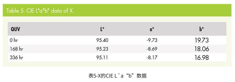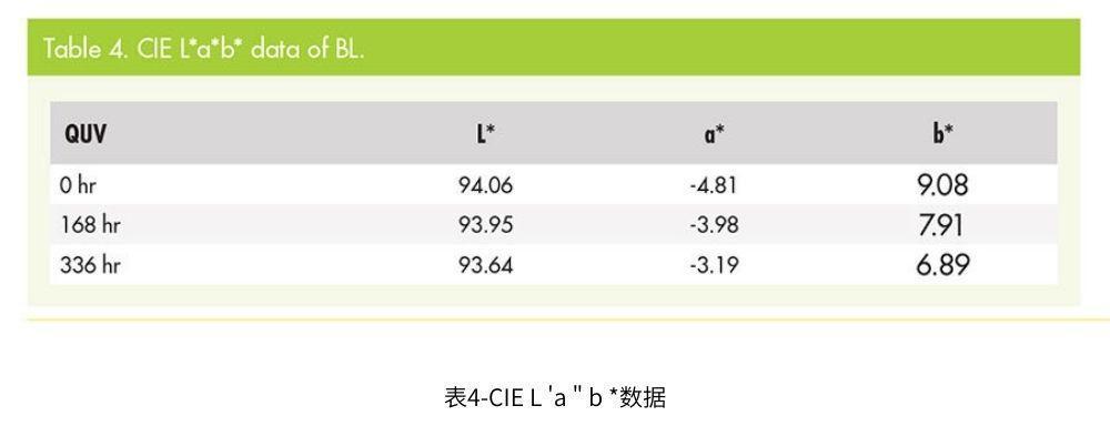 如果b*色是深黃色,會(huì)影響人的視線。BL是一種25 m的光學(xué)透明粘合劑,其b*值為9.08(見表4)。相對(duì)而言,X顯示b*為19.73,隨著QUV加速老化測(cè)試時(shí)間的推移,越來越低(見第16頁表5)。所以BL耐候性比黃色溶劑染料好,不影響視覺變化。