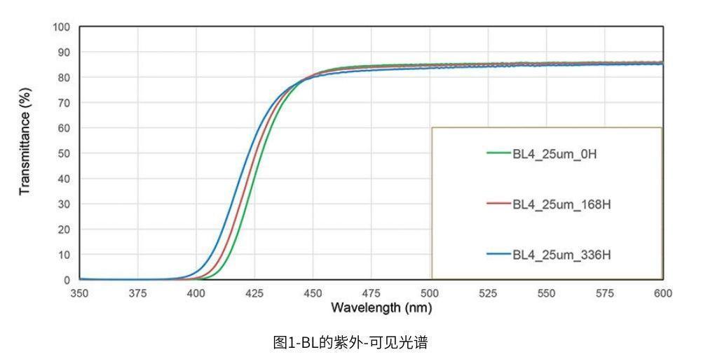 BL的透射率如圖1和表2所示。BL是一種25微米的光學(xué)透明粘合劑,能夠阻擋410納米的光透射,允許不到5%的光透過。樣品在500納米處的透射率保持相當(dāng)高。