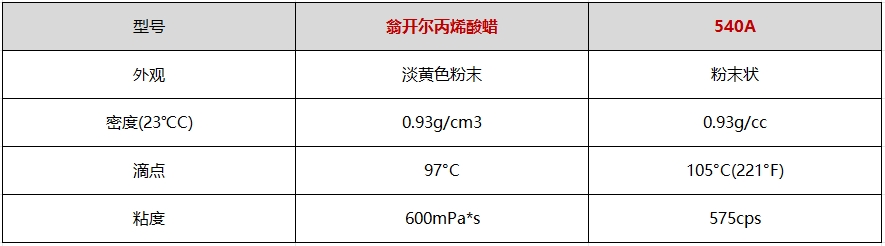 翁開爾丙烯酸蠟與540A技術(shù)參數(shù)對比