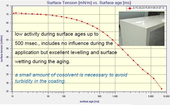 上圖為某品牌0.1%流平劑水溶液,在500ms氣泡壽命以內(nèi)的表活遷移速度很慢,對涂布時潤濕沒有影響。 在500ms以上的氣泡壽命,表面張力下降很快。在實際應(yīng)用中,流平時可以達到很好的效果。