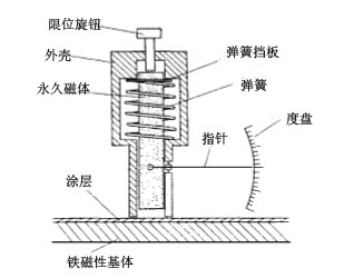 測量原理:探頭的下端與被測物體接觸,由于磁性基體和探頭內(nèi)永久磁體的磁引力作用,永久磁體將克服彈簧的彈力向下移動 ,位移的大小,取決于涂層的厚度。涂層薄,磁引力大,永久磁體的位移就大;涂層厚,磁引力小,永久磁體的位移就小。