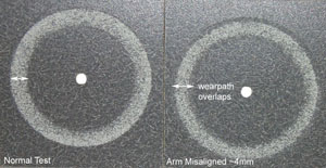 Taber試驗臂的對準是影響磨料的手臂的對齊,這就是上所述的車輪定位問題。一個4mm的錯位的影響包括約1000平方毫米的磨損區(qū)域的變化,和一個不太積極的測試。車輪重疊將從100%減少到約65%。圖片右側(cè)顯示層壓板臺面材料與儀器具有這個條件測試。