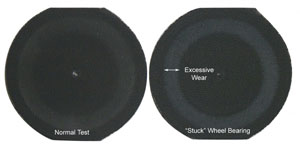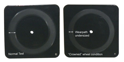 測試與車輪是圓形或加冕,可能會導(dǎo)致顯著偏離預(yù)期的結(jié)果。冠輪增加的壓力,在樣品界面,由于減少了接觸面積的 車輪。作為一個結(jié)果,樣品可能表明隨著一個矮小的wearpath早期失效。右邊的涂層試板是用cs-10車輪表現(xiàn)出“加冕”條件測試。