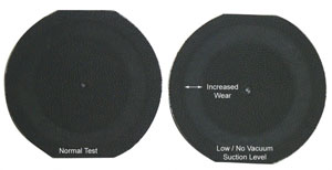 一個正常的泰伯真空系統(tǒng)從試樣表面的磨損試驗過程中產(chǎn)生的清除雜物是必要的(包括適當?shù)恼婵諊娮旄叨群驼婵瘴λ?。沒有真空,碎片可以建立在試樣有可能改變磨損類型從體3體。對于一些材料,如皮革,這種碎片可能會形成一個保護性的屏障,減少了車輪所造成的磨損量。對于其他樣品,如 涂層塑料,碎片積累的結(jié)果在一個更積極的測試,導(dǎo)致高于正常的霧度值。右邊的圖像顯示這種現(xiàn)象在一個皮革標本。