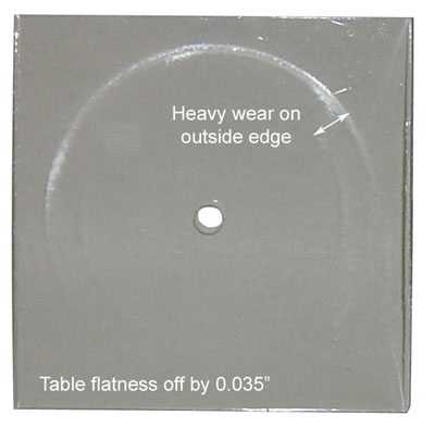 表跳動問題,典型地注意到一個表的擺動,可能會導(dǎo)致不正確的磨損,因為在表旋轉(zhuǎn)過程中的車輪接觸面積的變化。在一個透明的塑料涂層的情況下,一個沉重的磨損模式對樣品的外邊緣形成表跳動從0.035”。