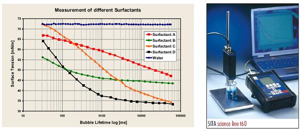 表面活性劑被廣泛應(yīng)用于許多工業(yè)中,用于改善產(chǎn)品性能。因此就需要檢驗(yàn)和分析表面活性劑的行為。表面活性劑主要的特點(diǎn)是它們的表面活性,即它們擴(kuò)散和吸附到新形成界面并影響其表面張力。因此,對(duì)于許多用途而言必須要知道表面活性劑的吸附過(guò)程快慢,以及在短時(shí)間內(nèi)表面張力的下降速度。由于表面張力依賴(lài)于表面活性劑的含量,所以我們可以通過(guò)測(cè)定表面張力的含量來(lái)分析表面張力。此外,溫度同樣會(huì)影響表面張力;測(cè)量表面張力也可以用于分析一種或多種表面活性劑混合的臨界膠束濃度。