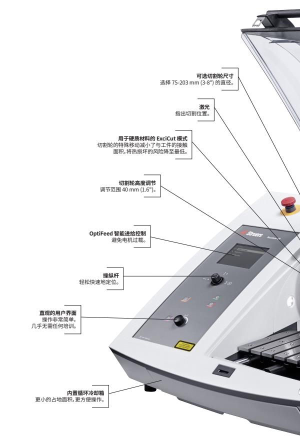 使用直觀的控制面板輕松設(shè)置簡單的控制面板和彩色顯示器使操作變得非常簡單,沒有復雜的菜單。 使用多功能旋鈕設(shè)置參數(shù),通過操縱桿快速定位工件,并且自動調(diào)整切割輪的高度。 是的,就是這樣簡單。