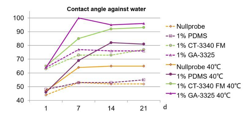 利用不同類型疏水添加劑的商用外墻涂料配方中接觸角(縱軸)隨時(shí)間(橫坐標(biāo))和溫度(常溫與40℃)的比較,結(jié)果顯示非離子的GA3325在常溫及40℃下具有更強(qiáng)疏水性。