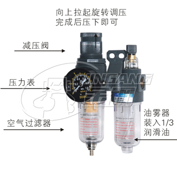 該氣源處理三聯(lián)件包括空氣減壓閥,過(guò)濾器、油霧器三大件。其中威壓閥可對(duì)氣源進(jìn)行穩(wěn)壓,使氣源處于恒定狀態(tài),可減小因氣源氣壓突變時(shí)對(duì)閥門或執(zhí)行器等到硬件的損傷。過(guò)濾器用于對(duì)氣源的清潔??蛇^(guò)濾壓縮空氣中的水分,避免水分隨氣體進(jìn)入裝置。油霧器可對(duì)機(jī)體運(yùn)動(dòng)部件進(jìn)行潤(rùn)滑??梢詫?duì)不方便加潤(rùn)滑油的部件進(jìn)行潤(rùn)滑,大大延長(zhǎng)機(jī)體的使用壽命。o
